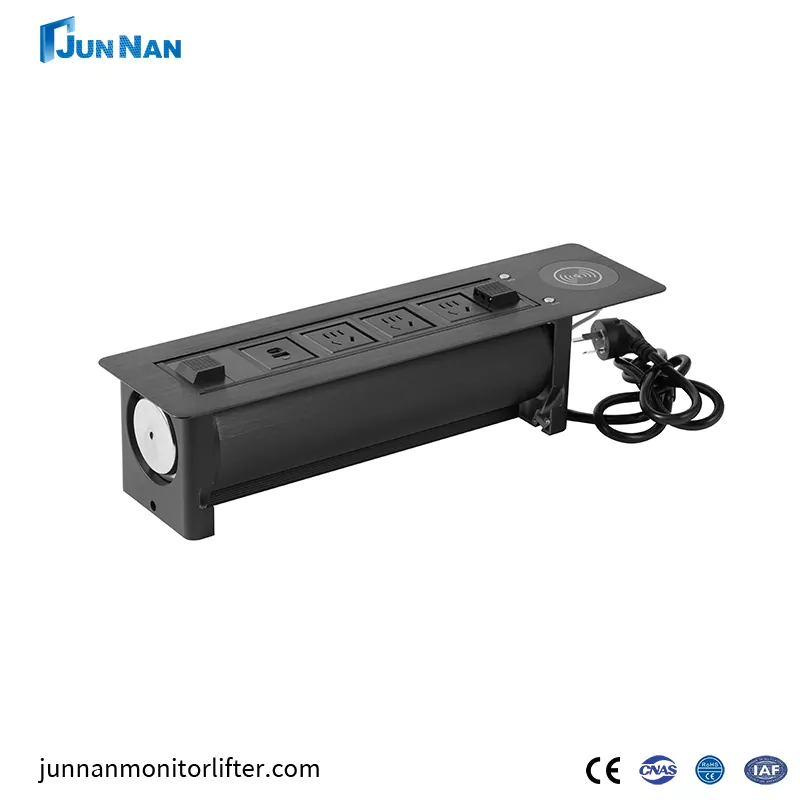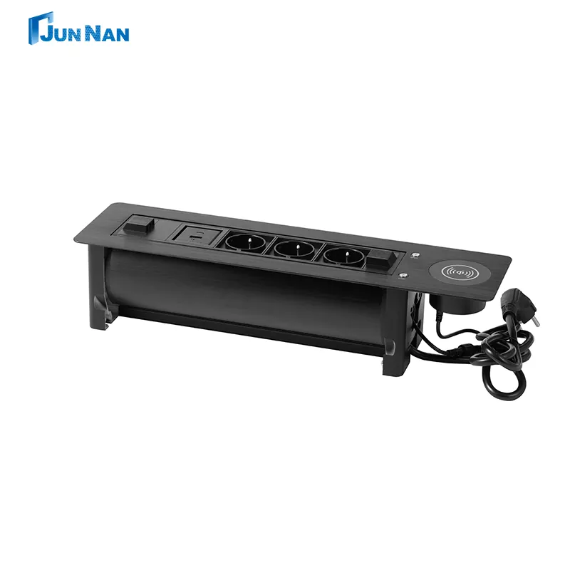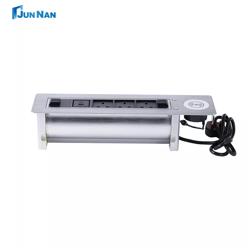 குவாங்சோ ஜூனன் சீனாவில் USB சார்ஜர் மற்றும் வயர்லெஸ் சார்ஜிங் மோட்டார் பொருத்தப்பட்ட ஸ்மார்ட் பாப் அப் டெஸ்க்டாப் சாக்கெட் உற்பத்தியாளர். பாப்-அப் டெஸ்க்டாப் சாக்கெட் என்பது டெஸ்க்டாப்பில் நிறுவப்பட்ட ஒரு வகையான சாக்கெட் சாதனமாகும், இது ஒரு குறிப்பிட்ட வழியில் பாப்-அப் செய்யப்படலாம் அல்லது அதை பயன்படுத்த மிகவும் வசதியாக இருக்கும், அதே நேரத்தில் டெஸ்க்டாப்பை நேர்த்தியாகவும், மாநாட்டிற்கு பயன்படுத்த எளிதாகவும் வைத்திருக்கலாம். அட்டவணை. இது வழக்கமாக ஒரு சுவிட்ச் பொத்தானைத் தொடுவதன் மூலம் உயர்த்தப்படும் அல்லது பாப்-அப் செய்யப்படுகிறது, மேலும் பயன்பாட்டில் இல்லாதபோது குறைக்கப்பட்டு மறைத்து, டெஸ்க்டாப்பின் இயல்பான பயன்பாட்டை பாதிக்காமல், டெஸ்க்டாப்புடன் ஃப்ளஷ் செய்யலாம். ஏசி ஜாக் மற்றும் யுஎஸ்பி மாட்யூல் பொருத்தப்பட்டுள்ளது. ஒரு புறத்தில் வெளிநாட்டுப் பொருளைச் செருகுவதால் ஏற்படும் மின்சார அதிர்ச்சியின் ஆபத்தைத் தடுக்க ஏசி ஜாக் ஒரு பாதுகாப்பு கதவுடன் வடிவமைக்கப்படலாம், மேலும் USB மாட்யூல் பல வெளியீட்டு போர்ட்களை வழங்கலாம், வேகமான சார்ஜிங் வெளியீட்டை ஆதரிக்கலாம் மற்றும் பல்வேறு வேகமான சார்ஜிங்கிற்கு ஏற்றவாறு மாற்றியமைக்கலாம். நெறிமுறைகள்.